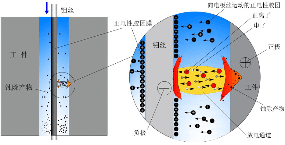 由于往复走丝的电极丝不能像低速单向走丝电极丝一样,采用镀锌保护层技术,但可以在工作液中添加电极丝表面保护膜组分,使得放电加工过程中保障电极丝尽可能少受到损伤,使得加工得以延续。所研制的JR3D乳化膏采用阳离子胶团保护技术,如图6所示,保护住电极丝尽可能少受到放电时正离子的轰击,并利用保护膜自身的气化带走部分正离子轰击电极丝后产生的热量,使电极丝尽可能少受损伤,从而使得电极丝承受放电能量的能力大大提高,电极丝损耗显著降低,同时断丝几率也大大下降,由于保护层物质一直由工作液产生,因此能始终在加工过程中保护住电极丝少受损伤。目前在杭州华方数控机床有限公司的普通方波脉冲电源加工条件下,6.5A切割在接近10000mm2/h效率前提下,电极丝一丝损耗(φ0.18→φ0.17)接近20万mm2(加工试件如图7),电极丝可以从φ0.18一直使用到φ0.12,完全达到了经济使用的条件,在此条件下进行的“中走丝”多次切割,其综合切割效率有大幅度提高。