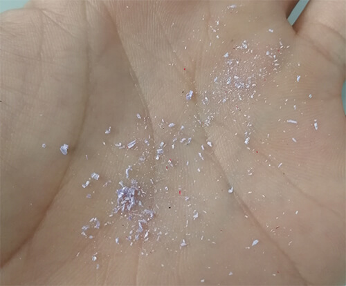 图6 假冒产品刮削油漆层用手搓捏后没有弹性,搓捏后呈破碎的颗粒状