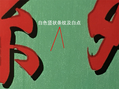 产品外包装采用特殊印刷工艺,印刷的彩桶表面肉眼仔细观察,某些区域尤其是有色块的区域可见比较明显的竖状白色条纹及白点如图3所示。如采用手机放大拍摄,而后再对拍摄照片进行放大,此白色条纹及白点将更加明显。